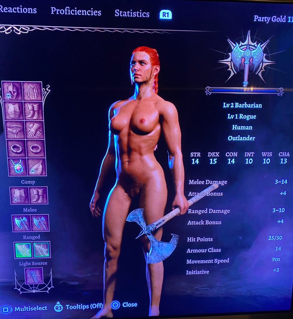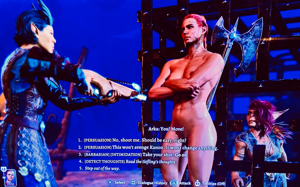 Again, it’s a bit odd when you’re cavorting with fully armored humans, tieflings, and elves, and you’re just standing there with your pubic area fully exposed. Even the goblins and orcs have the sense to cover themselves with the bare minimum rag. There is an option to remove your party members’ clothes, however, which was a tempting idea, but in the context of the story, it didn’t make sense, and I like to think Thelana’s nakedness is unique to her race. Still, none of the NPCs acknowledge her naked body, nor do they ever question it. In Skyrim, at least, I was often admonished to “at least put on . . . something,” which would have made for a nice touch of realism in BG3.